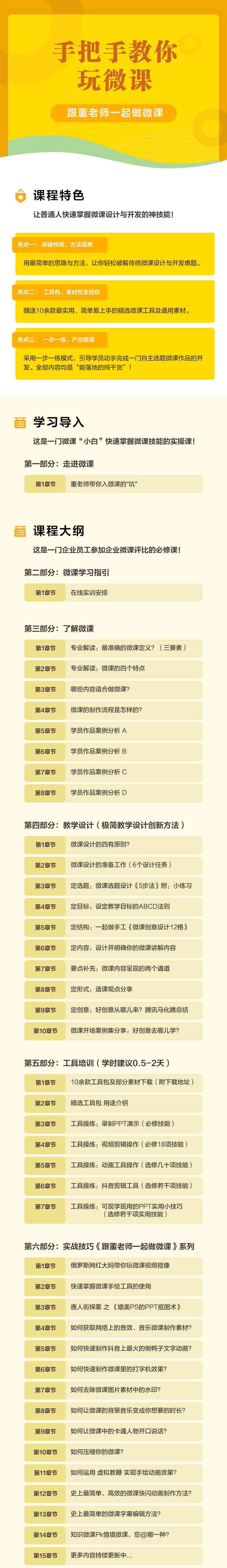 ·這是一門:能讓普通人快速掌握微課設(shè)計(jì)與開發(fā)技能的經(jīng)驗(yàn)分享課! ·這是一門:能讓微課“小白”快速掌握微課技能的實(shí)操課! ·這是一門:企業(yè)員工報(bào)名參加單位微課評(píng)比活動(dòng)的必修課! ·課程采用:一步一練模式,案例引導(dǎo)學(xué)員動(dòng)手完成一門自主選題微·課作品的開發(fā)。 ·全部?jī)?nèi)容:均是“經(jīng)得起實(shí)戰(zhàn)檢驗(yàn)“、“能落地的純干貨”! ·授課講師:觀點(diǎn)犀利,實(shí)操實(shí)戰(zhàn),誠(chéng)意滿滿! ·贈(zèng)送福利:精選10余款微課制作工具和素材全部給到你!